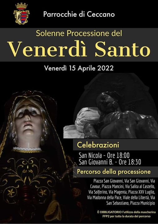 E’ stato deciso l’itinerario ridotto per la solenne processione del Venerdì Santo a Ceccano, che riprende la tradizione, interrotta per due anni a causa della pandemia. La processione con il Cristo morto e la Madonna addolorata uscirà dalla Collegiata di S. Giovanni battista verso le 20 di venerdì 15 aprile, proseguendo per via S. Giovanni, via Madonna degli angeli e poi via Cavour per arrivare in Piazza Camillo Mancini e poi scendere verso Piazza XXV Luglio. Da lì il percorso tradizionale sino a viale della Libertà: si tornerà a S. Giovanni per via S. Sebastiano.