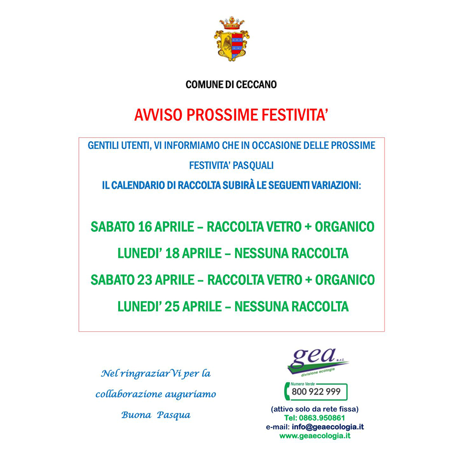 Sarà raccolto per due giorni di seguito l’umido nel comune di Ceccano. Domani, sabato 16 aprile, dopo che è già stato raccolto oggi venerdì. Il cambiamento delle giornate è dovuto alle festività. La successiva raccolta, però, ci sarà soltanto venerdì e poi il sabato successivo, 23 aprile. Il lunedì sarà ancora festivo e quindi bisognerà aspettare venerdì 29 aprile. Non si poteva trovare un altro giorno di raccolta, magari al martedì insieme all’indifferenziato?