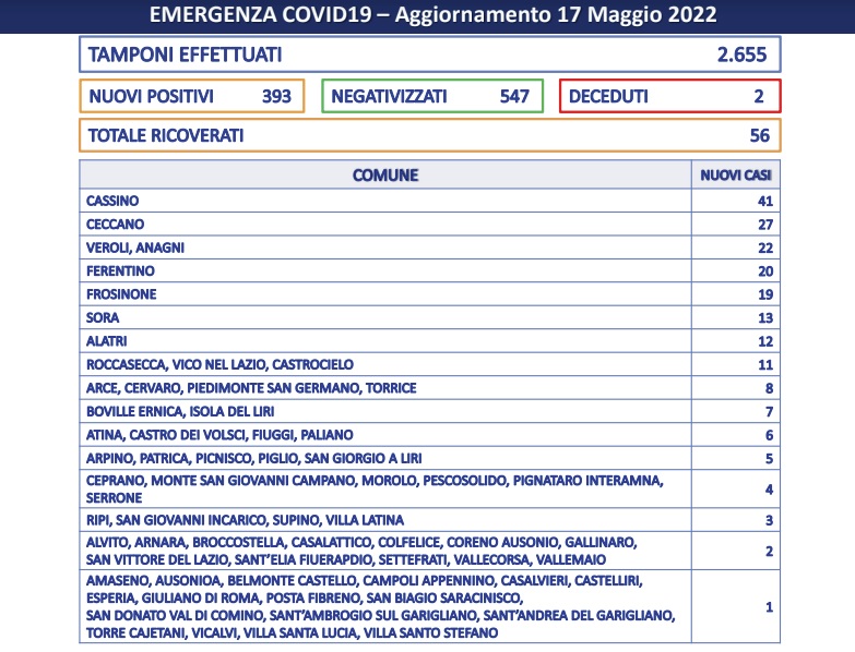 E’ una donna di 90 anni l’ultima vittima del covid nella cittadina vetuscolana. Secondo i dati resi noti dalla Asl, si registrano oggi altri 27 positivi e Ceccano è al secondo posto nella classifica dei centri urbani. Nessun dato da palazzo Antonelli dal 4 aprile.
