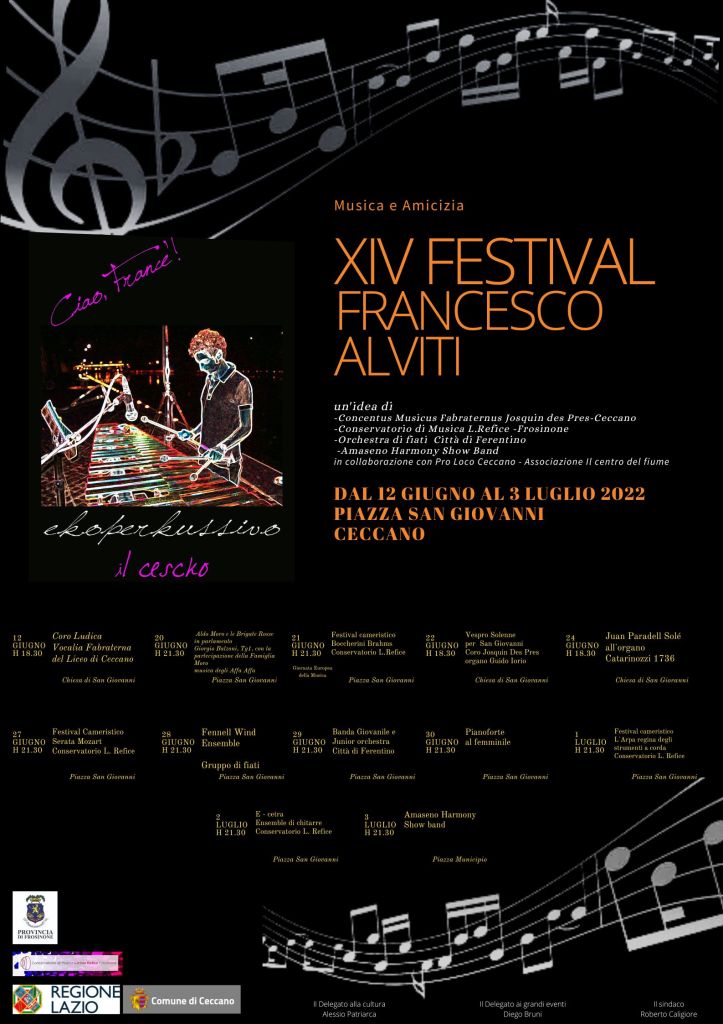 Il Festival Francesco Alviti, edizione XIV alla partenza, in Piazza S. Giovanni, con 12 serate di musica e di amicizia in ricordo del giovane percussionista scomparso a 22 anni nel 2009. Si comincerà il 12 giugno con il concerto delle giovani speranze musicali di Ceccano, il Coro Ludica Vocalia Fabraterna e l’Orchestra Juvenis Harmonia Fabraterna del Liceo di Ceccano che presenteranno un programma di melodie scritte appunto per cori giovanili. Il 20 giugno la musica degli Affa Affa accompagnerà la presentazione del libro Aldo Moro e le Brigate Rosse in parlamento, del giornalista del Tg1 Giorgio Balzoni, con la partecipazione di familiari delle vittime del terrorismo. Il 21 giugno, Festa Europea della Musica e prima antivigilia della festa patronale di S. Giovanni, sarà la volta della musica da camera del Conservatorio Licinio Refice di Frosinone, che presenterà musiche di Boccherini e Brahms in un vero e proprio Festival della Musica da Camera, curato da Francesca Vicari. Il giorno dopo, 22 giugno, antivigilia della Festa,il Concentus Musicus Fabraternus Josquin Des Pres, con all’organo Guido Iorio, e la direzione di Mauro Gizzi, appena eletto nuovo direttore del Conservatorio di Frosinone, animerà il Solenne Vespro per la Natività di S. Giovanni Battista, secondo la liturgia propria della Festa. Quindi sarà la volta dell’organo Catarinozzi del 1732, il 24 giugno,alle ore 19, suonato da Juan Paradell Solé, Organista Emerito della Cappella Musicale Pontificia “Sistina” in Vaticano e dallo scorso aprile Primo Organista della Basilica Papale di Santa Maria Maggiore in Roma. Il Festival proseguirà poi il 27 giugno, secondo appuntamento della Musica da Camera, con una serata tutta dedicata alla musica di Mozart. Il giorno successivo, il 28 giugno, sarà la volta degli ottoni con l’Orchestra fiati Fennell Wind Ensemble. Il 29, il Festival ospiterà la Banda giovanile di Ferentino e la Junior orchestra cui seguirà il 30 giugno una serata in cui il protagonista sarà il pianoforte, con un concerto tutto al femminile. Il 1° luglio sarà di scena L’Arpa, regina degli strumenti a corda, ultimo appuntamento della musica da camera. La serata successiva, 2 luglio, vedrà in piazza l’ensemble di chitarre E-cetra. Il Festival sarà concluso domenica 3 luglio dall’Amaseno harmony show band. Tutti i concerti in Piazza avranno inizio alle ore 21,30. Il Festival gode del patrocinio della Regione Lazio, della Provincia di Frosinone, dei Comuni di Ceccano, Amaseno e Ferentino