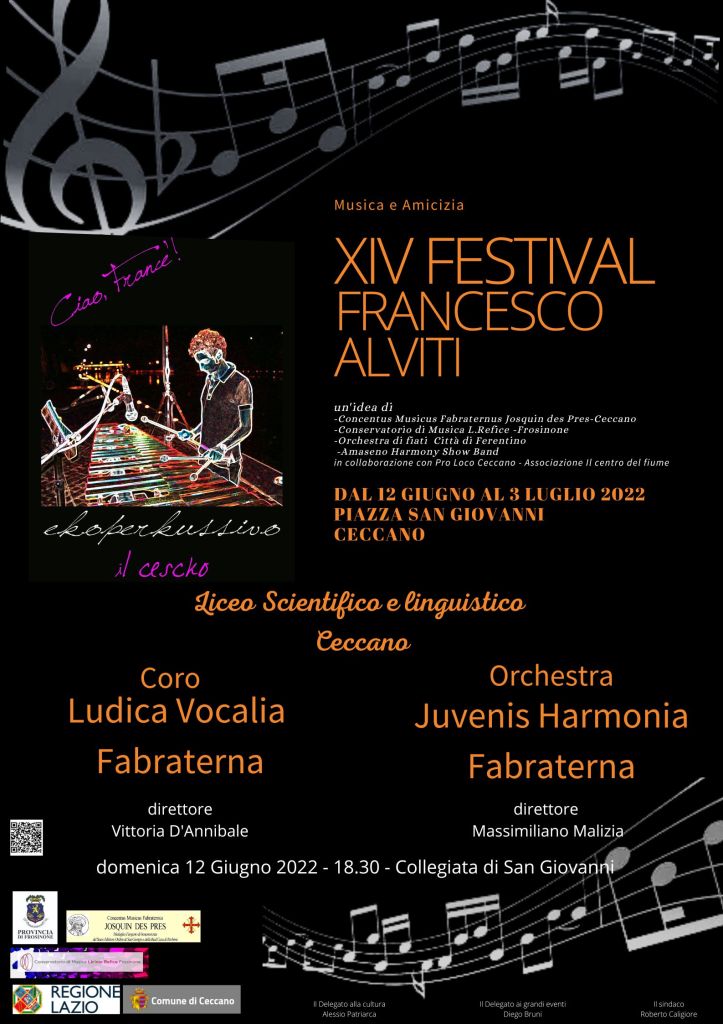 Saranno il Coro Ludica Vocalia Fabraterna e l’orchestra Juvenis Harmonia Fabraterna ad aprire il Festival Francesco Alviti, XIV Edizione, stasera, domenica 12 giugno, alle ore 18,30 nella Collegiata di S. Giovanni battista, a Ceccano. Ecco il programma di sala che accompagnerà tutte le serate del Festival, con contenuti visivi ed ampliamenti multimediali. Per goderselo meglio è sufficiente uno smartphone. Basterà puntarlo con la cam accesa sul qr code. Si aprirà l’e book e poi una piccola immagine di Francesco vi guiderà nel programma aumentato