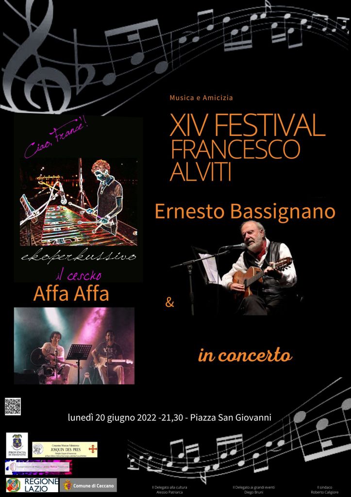 Bellissima musica nella splendida acustica di Piazza S. Giovanni a Ceccano, abbellita dai merletti dell’Associazione Il Filo che unisce e installati dalla Pro loco: lunedì 20 giugno il Festival torna in Piazza con il cantautore e presentatore radiofonico di Radio1 Ernesto Bassignano insieme agli Affa Affa, una delle più belle realtà musicali di Ceccano. L’evento è in collaborazione con l’Associazione Il centro del fiume ed inizierà alle ore 21,30. Il Festival Francesco Alviti, giunto alla XIV edizione, continuerà poi il 21 giugno, Festa Europea della Musica e prima antivigilia della festa patronale di S. Giovanni, con la musica del Conservatorio Licinio Refice di Frosinone, che presenterà musiche di Boccherini e Brahms in un vero e proprio Festival della Musica da Camera, curato da Francesca Vicari. Il giorno successivo, 22 giugno, antivigilia della Festa, il Concentus Musicus Fabraternus Josquin Des Pres, con all’organo Guido Iorio, e la direzione di Mauro Gizzi, appena eletto nuovo direttore del Conservatorio di Frosinone, animerà il Solenne Vespro per la Natività di S. Giovanni Battista, secondo la liturgia propria della Solennità. Quindi sarà la volta dell’organo Catarinozzi del 1732, il 24 giugno, alle ore 18, con un concerto di musiche scelte per quello strumento, che da quasi 3 secoli accompagna le celebrazioni in S. Giovanni. Il Festival proseguirà poi il 27 giugno, secondo appuntamento della Musica da Camera, con una serata tutta dedicata alla musica di Mozart. Il giorno successivo, il 28 giugno, sarà la volta dei fiati con l’Orchestra Fennell Wind Ensemble. Il 29, il Festival ospiterà la Banda giovanile di Ferentino e la Junior orchestra, cui seguirà il 30 giugno una serata dedicata al pianoforte, con un concerto tutto al femminile. Il 1° luglio sarà di scena L’Arpa, regina degli strumenti a corda, ultimo appuntamento della musica da camera, seguito il 2 dalla piece teatrale Ricomincio da Clam che la regista Beatrice Mancini ha volutod edicare a suo pare, l’avv. Claudio Mancini. Il Festival sarà concluso domenica 3 luglio dall’Amaseno harmony show band. Tutti i concerti in Piazza avranno inizio alle ore 21,30. Il Festival gode del patrocinio della Regione Lazio, della Provincia di Frosinone, dei Comuni di Ceccano, Amaseno e Ferentino.