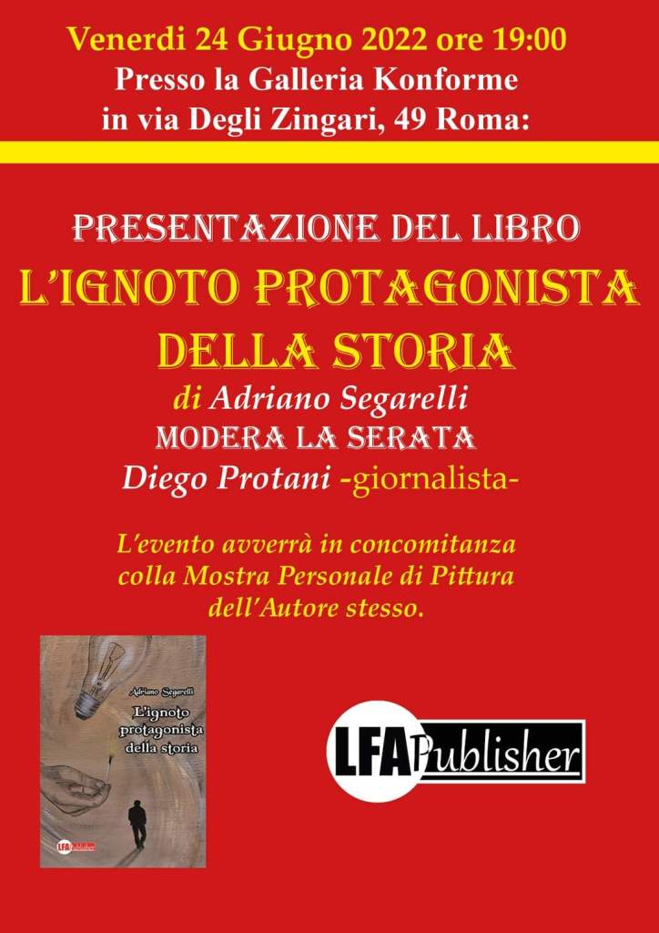 Sarà il ceccanese Diego Protani a presentare il libro L’ignoto protagonista della storia di Adriano Segarelli, presso la galleria Kornforme, in via degli Zingari, 49, nel quartiere Monti a Roma. Segarelli nasce a Roma nel dicembre del ’78. È un artista contemporaneo e scrittore. Pittore autodidatta, inizia la sua formazione con le mostre collettive a “cascina Farsetti” ottenendo un merito artistico nella IV edizione di pittura e grafica “natale di Roma” nell’aprile del 2009, promossa dall’artista Paolo Urbini. La sua pittura si sviluppa su un figurativo concettuale con lievi sfumature metafisiche in una ricerca incessante in una sorta di destrutturalismo interiore che ha l’esigenza di andare oltre la forma per cercare nell’interno la parte emotiva e introspettiva dell’essere umano.