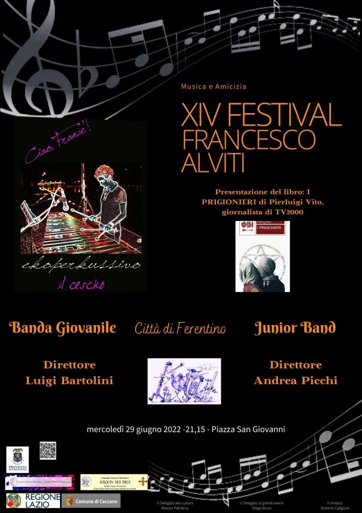 Un libro, due bande musicali, una mostra d’arte: riprende alla grande il Festival Francesco Alviti mercoledì 29 giugno, con due extra particolarmente interessanti. La serata in Piazza S. Giovanni a Ceccano inizierà alle 21,15, con la presentazione del libro I prigionieri del giornalista Pierluigi Vito, sul dramma del terrorismo in Italia. Sarà presente l’autore. Quindi due bande musicali della Città di Ferentino, la Junior Band, diretta da Andrea Picchi, e la Banda Giovanile, diretta da Luigi Bartolini, con un divertente programma di musiche che vanno dai Blues Brothers alle grandi colonne sonore. Durante il concerto sarà possibile ammirare anche una mostra di disegni d’autore. Il Festival proseguirà il 30 giugno una serata dedicata al pianoforte, con il recital di Marica Staccone, con musiche di Beethoven, Chopin e Brahms. Il 1° luglio sarà di scena L’Arpa, regina degli strumenti a corda, ultimo appuntamento della musica da camera, Il Festival si trasferirà in Piazza XXV Luglio domenica 3 luglio con il rombo del tuono dell’Amaseno harmony show band. E poi le due chicche finali: lunedì 4 luglio con il ritorno al Festival degli Ica brothers e il 5 luglio la conclusione con la piece teatrale Ricomincio da Clam che la regista Beatrice Mancini ha voluto dedicare a suo padre, l’avv. Claudio Mancini.