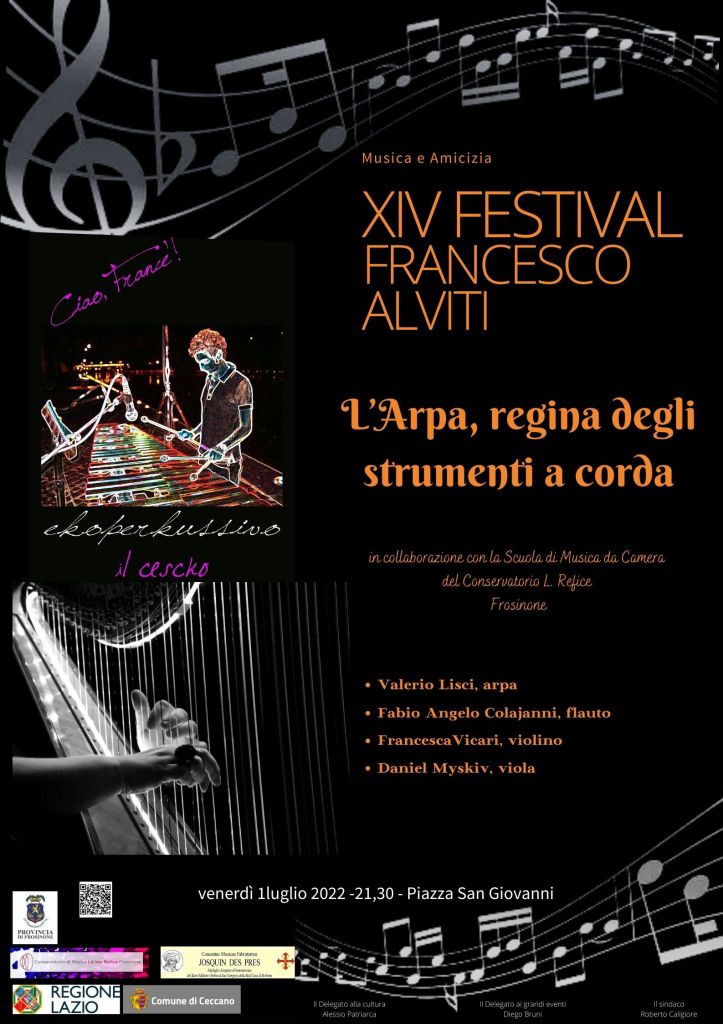 L’arpa regina degli strumenti a corda è il titolo dello straordinario concerto che si terrà stasera 1° luglio, alle ore 21,30 a Ceccano per il Festival Francesco Alviti, giunto alla quartultima serata di un programma vario ed interessante. Ieri sera il recital pianistico con la giovane ed apprezzatissima Marica Staccone, stasera ci sarà Valerio Lisci, altrettanto giovane ed altrettanto apprezzato arpista a livello internazionale, professore al Conservatorio Licinio Refice di Frosinone che sarà accompagnato da Fabio Angelo Colajanni al flauto, Francesca Vicari al violino e Daniel Myskiv alla viola. In programma musiche di Rossini, Ibert e Debussy. Un concertro assolutamente da non perdere. Le ultime tre serate del Festival vedranno esibirsi in Piazza XXV Luglio domenica 3 il rombo del tuono dell’Amaseno harmony show band, lunedì 4 luglio il ritorno al Festival degli Ica brothers in Piazza S. Giovanni e il 5 luglio la conclusione con la piece teatrale Ricomincio da Clam che la regista professionista Beatrice Mancini ha voluto dedicare a suo padre, l’avv. Claudio Mancini, appassionato frequentatore del Festival, cultore di musica e di tante altre attività liberali.