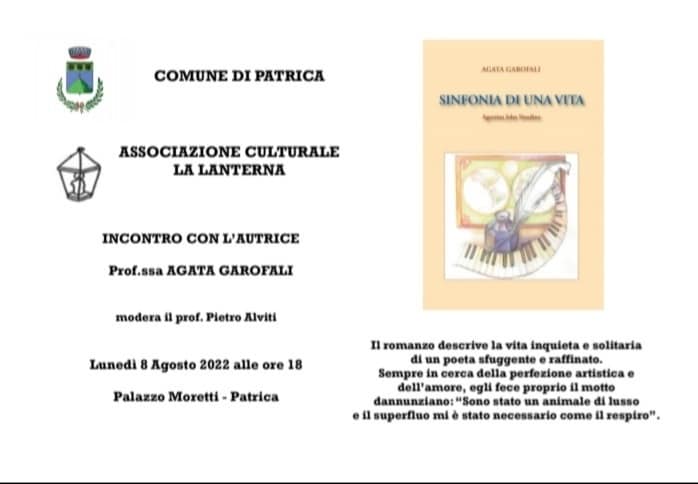 Visse un periodo anche a Ceccano, in una delle dimore signorili di via Gaeta, perché sua moglie era originaria della cittadina vetuscolana: poeta, giornalista, viaggiatore Agostino John Sinadore è una delle personalità più interessanti e misconosciute del XX secolo, poeta e amico di poeti, scrittori, musicisti, conobbe D’Anninzio proprio nel periodo in cui soggiornò Ceccano, ospite della famiglia Sindici che allora produceva un vino famoso nel mondo castel Sindici. Agata Garofali ne traccia una biografia romanzata nel libro Sinfonia di una vita, immaginando la vita di Sinadino come una serie di movimenti musicali, perché sono gli unici forse a poter rappresentare un’esperienza umana tanto complessa. Il libro sarà presentato a Patrica, palazzo Mancini, lunedì 8 agosto, alle ore 18, per una iniziativa del Comune Lepino.