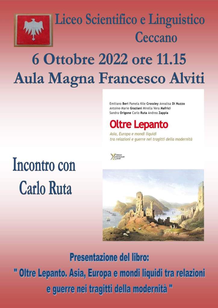 Oltre Lepanto, Asia ed Europa, mondi liquidi tra relazioni e guerre: sono il titolo e il sottotitolo del libro che sarà presentato giovedì 6 ottobre, alle ore 11 nell’aula magna Francesco Alviti. A presentarlo, Carlo Ruta, uno degli autori di questo interessante testo che rivede la tradizionale interpretazione della battaglia di Lepanto e soprattutto di quella seconda metà del secolo XVI. Contemporanemanete allo scontro bellico c’erano anche relazioni commerciali, culturali, di amicizia anche fra mondi che erano tutt’altro che monolitici. Il convegno è organizzato dal Liceo di Ceccano in collaborazione con l’Associazione Il Centro del Fiume ed è inserito nella settimana della pace, curata dalle Associazioni di Ceccano, coordinate dalla Pro loco.