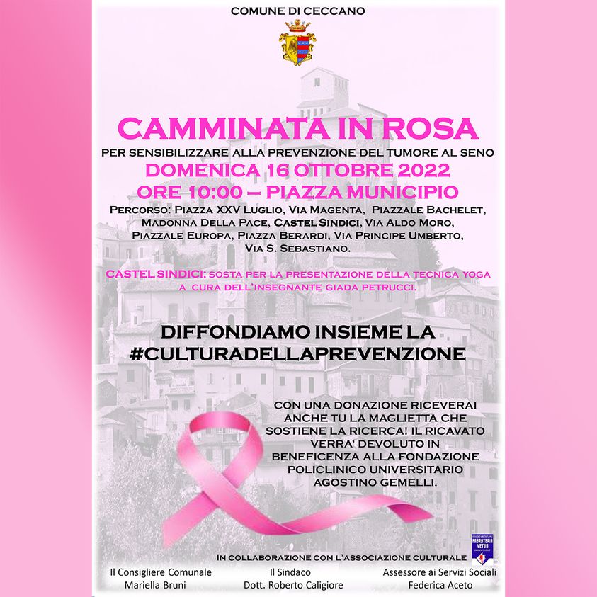 Si svolge stamane a Ceccano, con inizio alle ore 10, la Camminata in Rosa, iniziativa del Comune in favore della Fondazione Policlinico Gemelli di Roma per diffondere la cultura della prevenzione del tumore al seno. La camminata prenderà l’avvio in Piazza XXV Luglio per arrivare a Piazza Berardi e poi risalire lungo via Principe Umberto.