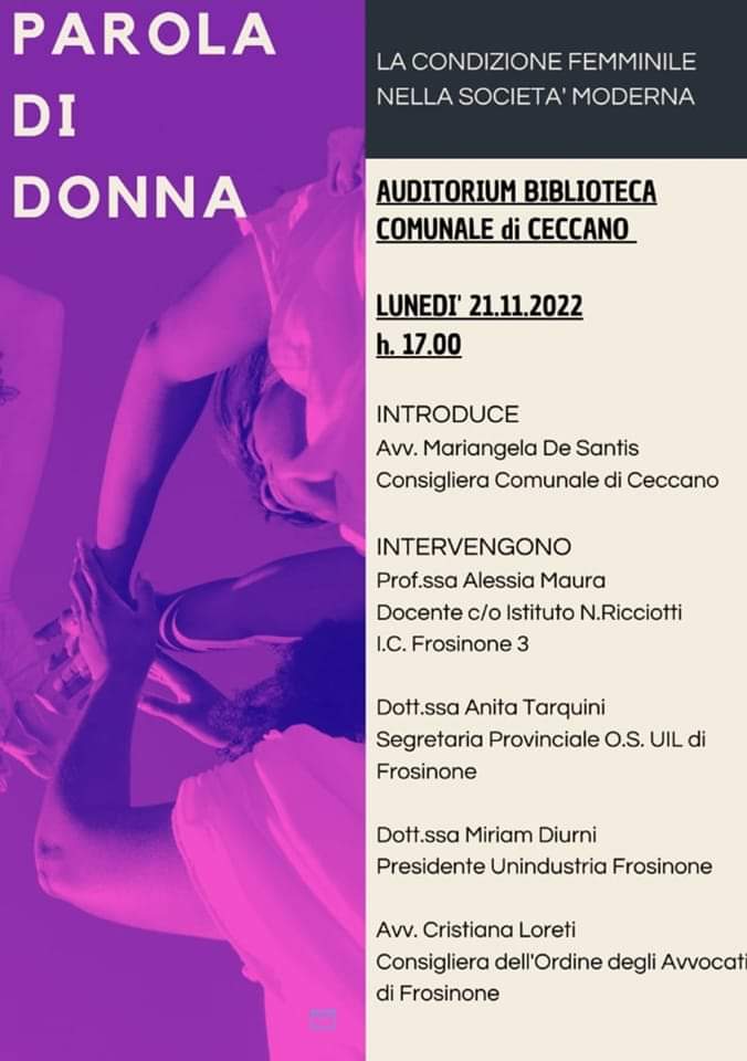la condizione femminile nella società moderna è il tema dell’incontro che si svolgerà lunedì 21 novembre alle ore 17 nell’auditorium della biblioteca Filippo M. De Sanctis a Ceccano. Interverranno Mariangela De Santis, avvocato e consigliera comunale di Ceccano, Alessia Maura, docente all’IC 3 di Frosinone, Anita Tarquini, architetto e segretaria provinciale della UIL, Miriam Diurni, presidente Unindustria di Frosinone e Cristiana Loreti, avvocato e consigliera dell’ordine. Obiettivo del convegno è quello di far il punto sulla condizione femminile, alla viglia della giornata contro la violenza.