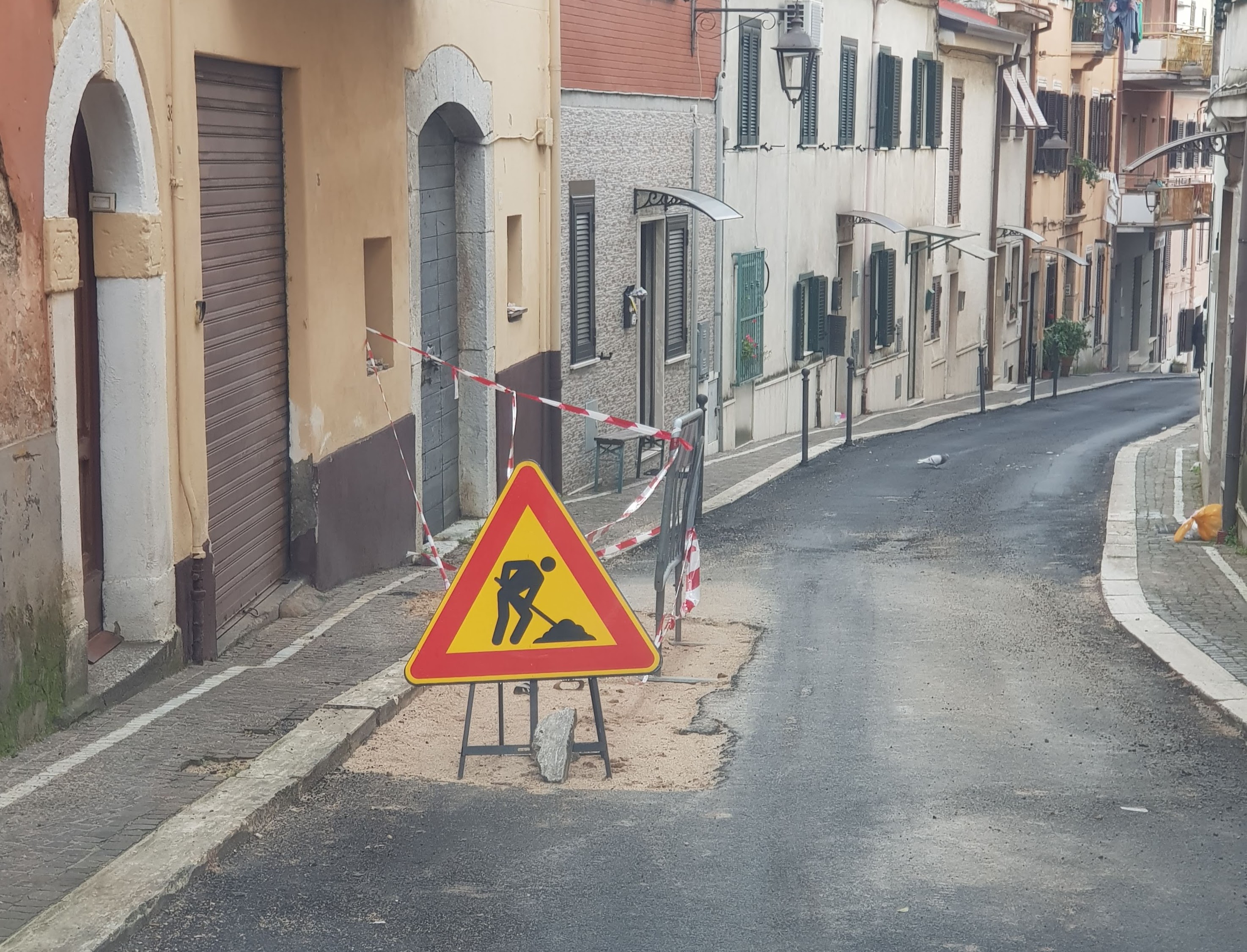 Appariva così, stamane, dopo che qualche giorno fa era stato steso il nuovo asfalto: via Solferino è una strada che ne ha viste di tutte in questi anni. Fu ripavimentata completamente nel 2009, con i cosiddetti marciapiedi a scomparsa, nel senso che i marciapiedi furono realizzati ma sono a filo con la sede stradale, così che non se ne comprende la ragione. Dovettero mettere dei dissuasori per proteggere i pedoni che insistevano a camminare sui marciapiedi a scomparsa… Nel 2011 un ulteriore rifacimento, con la proposta di cambiare il nome ad una strada in cui i lavori avevano fatto sì che l’acqua entrasse tranquillamente nelle abitazioni. Veniva proposto via Maria Cazzetta. Poi nel 2013, l’Acea prova a rifare le tubature e s’accorge che quelle del gas sono ad una profondità inferiore al dovuto e perciò si rialza ancora la sede stradale. Insomma davvero una strada senza pace. Ora nuovo asfalto e, qualche giorno dopo, chiusura della strada, senza che nessuno lo sapesse, neppure i vigili, e nuova buca… Nella foto potete ammirare anche i marciapiedi a scomparsa. I blocchi in travertino per il rialzo della sede pedonale sono sotto la superficie, forse per consevarli meglio.