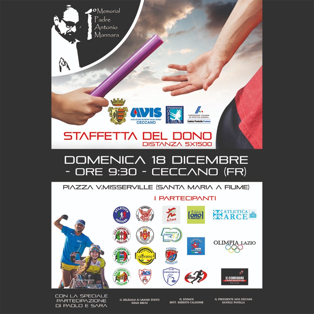 Tante associazioni sportive per la Staffetta del dono, manifestazione di atletica leggera, organizzata dall’Avis di Ceccano con la collaborazione di tanti gruppi di sportivi che saranno impegnati in una gara a squadre, ognuna composta da 5 componenti, ciascuno dei quali dovrà percorrere 1500 metri prima di cedere il testimone all’altro. La gara., che si svolge con il patrocinio del comune di Ceccano, inizierà alle 9,30 di domenica 18 dicembre, attorno al Santuario di Santa Maria a fiume, dove P. Antonio Mannara, cui è dedicata la staffetta, era stato parroco per tanti anni.