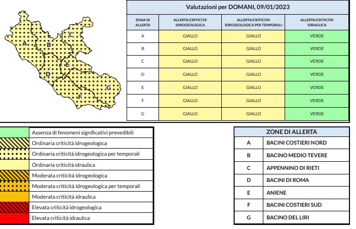 La Protezione Civile del Lazio ha emanato l’allerta gialla per tutta la Regione: dalle prime ore di domani, lunedì 09.01.2023, e per le successive 18-24 ore, si prevedono sul Lazio precipitazioni da sparse a diffuse, anche a carattere di rovescio o temporale, specie sui versanti tirrenici delle aree montuose. I fenomeni saranno accompagnati da rovesci di forte intensità, frequente attività elettrica e forti raffiche di vento. Dalle prime ore di domani, lunedì 09.01.2023, inoltre, e per le successive 18-24 ore, si prevedono venti forti o di burrasca, specie sui crinali appenninici, tendenti a ruotare da ovest/nord-ovestin mattinata, con possibili mareggiate sulle coste esposte