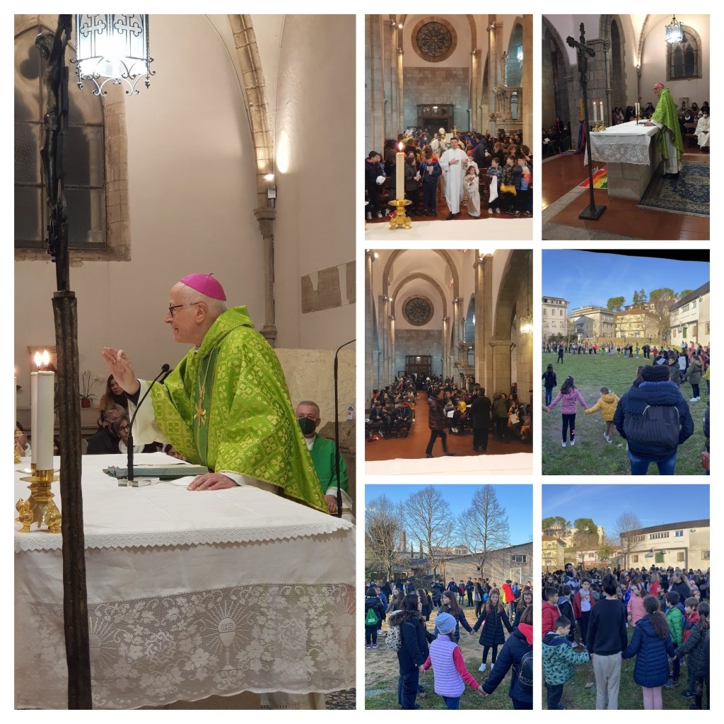 Ne aspettavano trecento, ne sono venute 100 di più, tanto da mettere a dura prova l’organizzazione che però ha superato alla grande la prova: una marea di ragazzi hanno giocato, discusso, ragionato, sulla pace, su come costruirla, su come porre riparo alla guerra. Santa Maria a fiume, la chiesa di Ceccano distrutta dalle bombe della guerra il 26 gennaio del 1944 è stata il luogo ideale e simbolico della giornata organizzata dall’Azione Cattolica dei ragazzi, dall’Ufficio Catechistico Diocesano e dall’Ufficio Missionario, sabato 14 gennaio 2023. I ragazzi sono venuti da tanti centri della diocesi, con i loro educatori e anche tanti parroci e si sono ritrovati poi attorno al loro vescovo, in una chiesa rallegrata dai fazzoletti colorati dei ragazzi che hanno espresso la loro gioia ma hanno anche ascoltato le parole di mons. Spreafico. Bisogna che la vostra vita sia un dono per i vostri compagni i vostri genitori, i vostri amici, così costruirete la pace, ha detto il vescovo ai ragazzi che occupavano tutti gli spazi possibili all’interno del santuario, invitandoli ad imparare la dimensione dell’ascolto degli altri come gradino ineludibile della pace. Vi do un incarico, ha concluso il vescovo, al mattino, prima di fare ogni altra cosa, dite: Gesù dona la pace al mondo. All’inizio della celebrazione, l’assistente diocesano dell’Acr, don Giovanni Ferrarelli, aveva salutato il vescovo a nome dei ragazzi indicando nella testimonianza dei giovani per la pace la speranza per il nostro mondo. Qui davanti, ha detto don Giovanni, abbiamo il futuro della nostra chiesa, del nostro paese. Per loro dobbiamo impegnarci.
