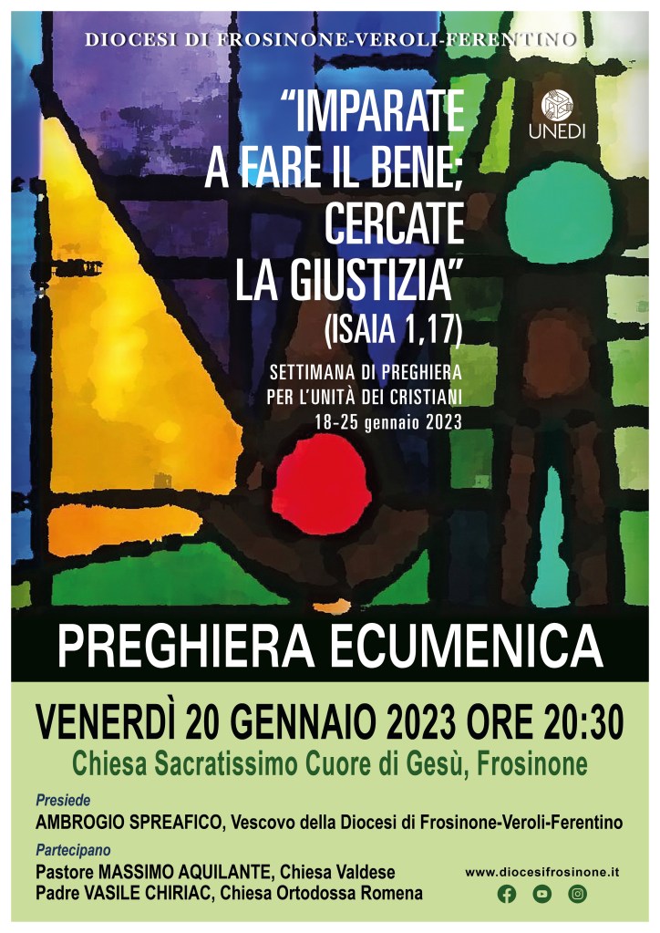 Insieme a Mons. Spreafico, vescovo di Frosinone, ci saranno il pastore Massimo Aquilante della Chiesa Valdese e padre Vasile Chiriac, della Chiesa Ortodossa Rumena che pregheranno insieme per la Settimana per l’Unità dei Cristiani, che si svolge ogni anno dal 18 al 25 gennaio. L’appuntamento a Frosinone, nella Chiesa del Sacro Cuore, è per venerdì 20 gennaio, alle ore 20,30. Quest’anno la preghiera sarà incentrata su un versetto del profeta Isaia, 1,17: Imparate a fare il bene, cercate la giustizia