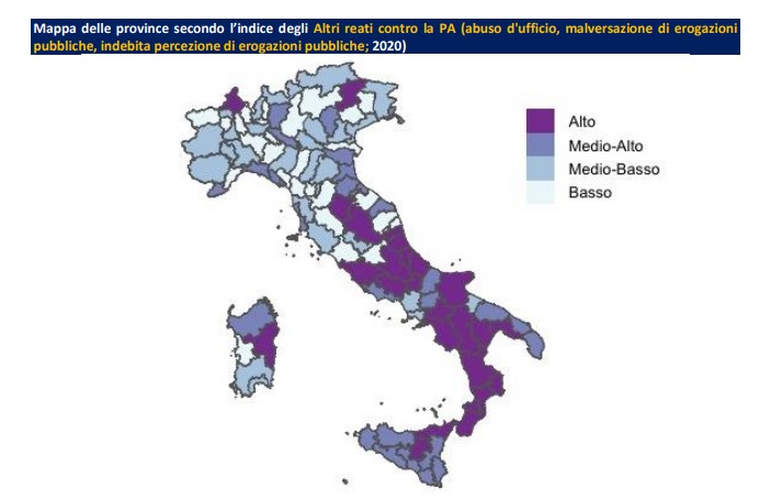 Abuso d’ufficio, malversazione di erogazioni pubbliche, indebita percezione di erogazioni pubbliche: sono le tipologie di reato per cui il territorio della provincia di Frosinone è al 14° posto nella classifica italiana, stilata sulla base delle denunce presentate nel 2020. I dati sono contenuti nell’inchiesta di Unioncamere recentemente pubblicata. Su un indice medio dell’intero Paese pari a 100, la provincia di Frosinone è a 155,4. Al primo posto della triste classifica, c’è Vibo Valentia, con un indice pari a 521,8, mentre Roma è a 203. Per i reati di corruzione, la provincia di Frosinone si situa al 33° posto, con un indice di 106, mentre per concussione e peculato è al 40° con 116