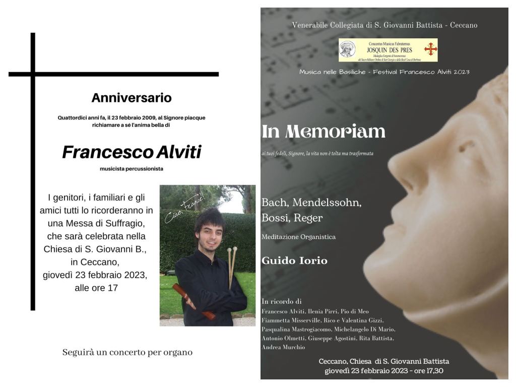 Bach, Mendelssohn, Reger: saranno le loro note ad aiutarci a vincere il male e a trasformarlo in bene, in occasione del XIV anniversario della morte del giovane percussionista Francesco Alviti, il 23 febbraio del 2009. Il ricordo di Francesco ma anche quello di Ilenia Pirri, Pio di Meo Fiammetta Misserville, Rico e Valentina Gizzi, Pasqualina Mastrogiacomo, Michelangelo Di Mario, Antonio Olmetti, Giuseppe Agostini, Rita Battista, Andrea Murchio saranno affidati all’organista Guido Iorio che proporrà la sua meditazione organistica, con lo strumento che proprio gli amici di Francesco vollero offrire alla Collegiata di S. Giovanni battista a Ceccano. Il concerto In memoriam seguirà la celebrazione della messa di suffragio per Francesco, fissata alle 17 del 23 febbraio 2023