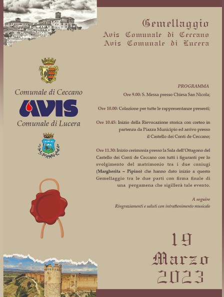 Si terrà domenica 19 marzo al castello dei Conti il gemellaggio tra le Avis di Ceccano e di Lucera. Si tratta di una iniziativa della sezione dei donatori di Ceccano che vuole così consolidare i rapporti con altre realtà del mondo della donazione. Ci sarà anche una rievocazione delle vicende storiche di Lucera, con inizio in Piazza Municipio alle 10,45.