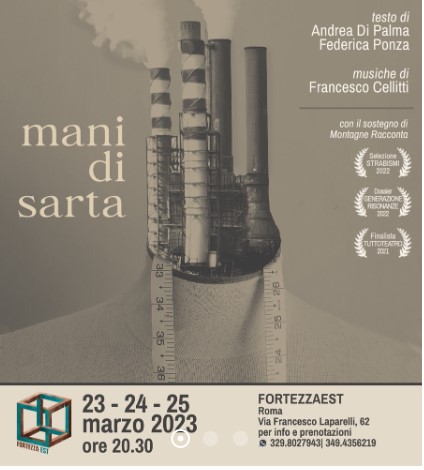 La prima ci sarà il 23 marzo sul palcoscenico di Fortezza Est a Roma: finalista al premio“Dante Cappelletti” 2021 e selezionato al Festival Strabismi 2022, debutta per la prima volta in forma completa “Mani di sarta” di e con Andrea Di Palma, autore insieme a Federica Ponza di un testo sincero e commovente che partendo dalla storia personale della nonna dell’autore, racconta uno spaccato dolente della storia recente d’Italia: l’inquinamento ambientale della Valle del Sacco nel cuore della Ciociaria.