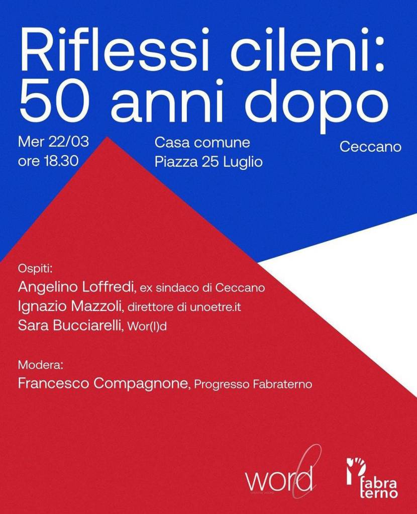 Sono trascorsi 50 anni dall’11 settembre del 1973, quando i militari cileni deposero con la forza il presidente Allende, uccidendolo all’interno della Rosada, il palazzo presidenziale di Santiago. Quelle vicende ebbero un’eco fortissima nella politica italiana perché molti temevano potesse esserci una vicenda simile anche nel notro paese. Di quelle vicende discuteranno i giovani di Progresso Fabraterno a Ceccano, mercoledì 22 marzo, alle ore 18,30 nella casa Comune in Piazza 25 Luglio, con interventi di Angelino Loffredi, Ignazio Mazzoli e Sara Bucciarelli. Il dibattito sarà moderato da Francesco Compagnoni.