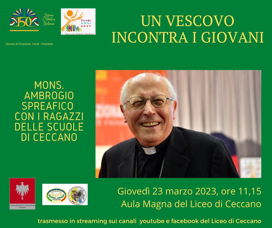 Il vescovo incontra i giovani è il titolo del colloquio che gioved 23 marzo 2023, alle ore 11,15, nell’aula magna Francesco Alviti del Liceo di Ceccano, mons. Ambrogio Spreafico, vescovo di Frosinone, terrà con i giovani delle scuole di Ceccano. E’ stata scelta l’aula magna del Liceo per la possibilità di trasmettere in streaming l’incontro che sarà visibile per tutti sulla pagina facebook e sul canale youtube del Liceo di Ceccano. Con il vescovo ci saranno una rappresentanza degli studenti del Liceo e dell’IIS di Ceccano. L’incontro, per iniziativa della Presidenza Diocesana dell’Azione Cattoloica, vuole dare voce ai giovani, in maniera libera ed aperta, nell’ambito dell’itinerario sinodale di ascolta che la diocesi di Frosinone svolge in quest’anno. Temi del dibattito saranno la condizione giovanile, la ricerca di senso, i rapporti con la spiritualità e con la fede.