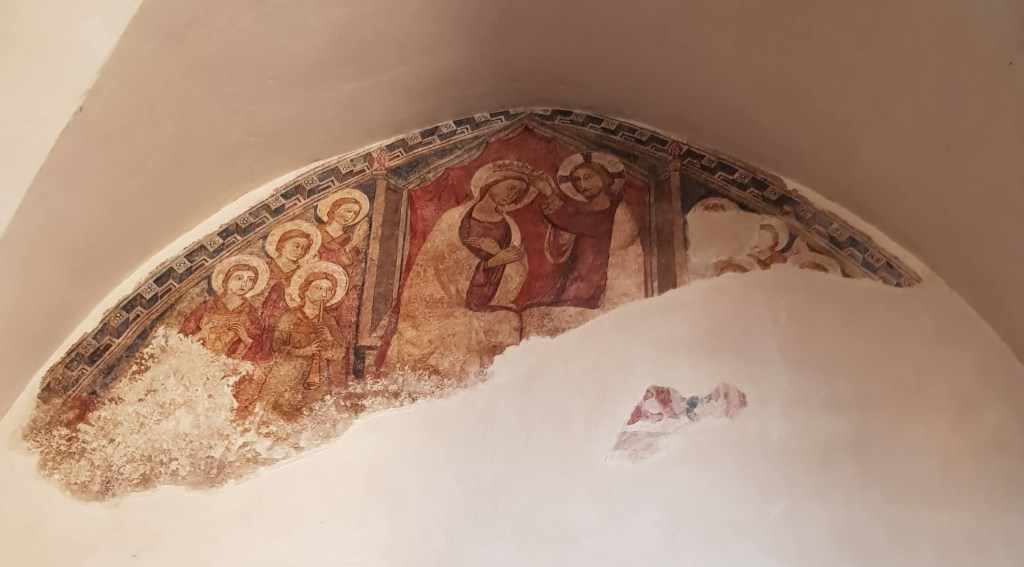Gli affreschi possono datarsi, per ragioni stilistiche, intorno alla metà del XIV secolo. La scena dell’Incoronazione della Vergine è racchiusa infatti da una fascia decorata a motivi cosmateschi, che discendono da quelli di Giotto ad Assisi, e che si diffondono successivamente a Subiaco, a Napoli e poi ancora nel Lazio meridionale.
