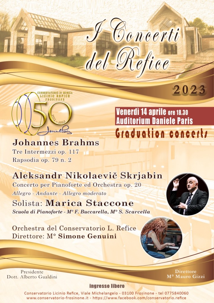 Saranno i tre intermezzi opera 117 e la Rapsodia op.79 di Brahms e il Concerto per pianoforte ed orchestra di Skrjabin op. 20 a segnare il traguardo accademico per la giovane pianista di Ceccano, Marika Staccone, venerdì 14 aprile, alle ore 18,30, nell’auditorium Daniele Paris, del Conservatorio Licinio Refice a Frosinone. Con lei, l’orchestra del Conservatorio, diretta da Simone Genuini. L’ingresso è libero.