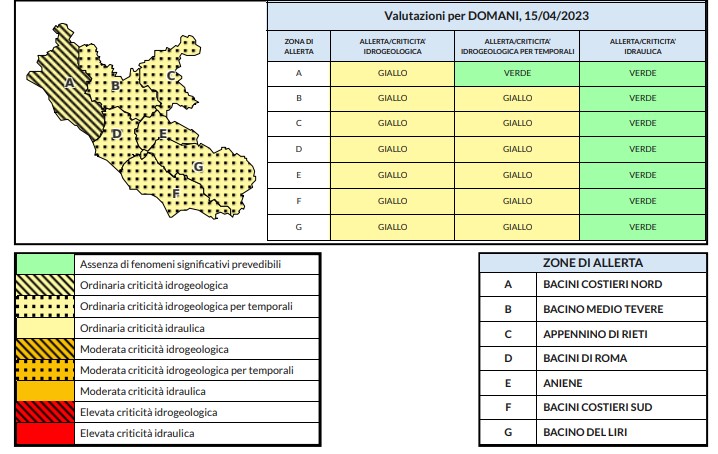 Precipitazioni da sparse a diffuse, anche a carattere di rovescio o temporale, specie sui settori costieri. I fenomeni saranno accompagnati da rovesci di forte intensità, frequente attività elettrica, possibili grandinate e forti raffiche di vento. Lo si legge sul bollettino di allertamento della Protezione civile per la provincia di Frosinone che è stata messa in allerta gialla dalla mattinata di sabato 15 aprile, per le successive 24 ore.
