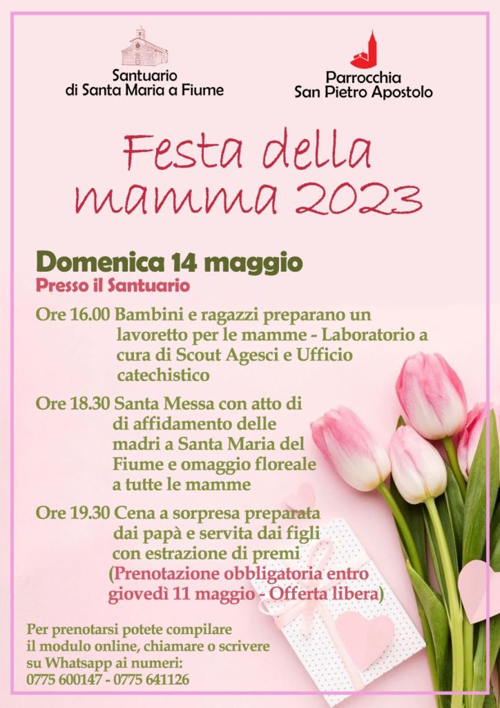 Saranno le mamma al centro delle attività al Santuario di Santa Maria a fiume a Ceccano, oggi, domenica 14 maggio: l’appuntamento per i bambini è alle 16 per preparare ciascuno un regalino da dare alla propria mamma. Poi, durante la messa delle 18,30, ci sarà l’affidamento di tutte le madri a Santa Maria a fiume, per concludere con la cena a sorpresa con i papà impegnati a preparare il cibo e i figli a servire le mamme.