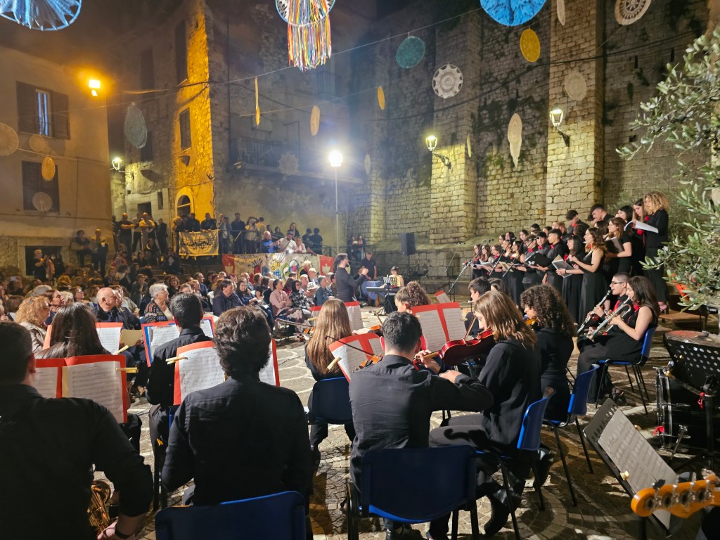 Hanno dovuto tirar fuori le sedie dalla chiesa: Piazza S. Giovanni era strapiena di gente per il concerto del Coro e dell’Orchestra del Liceo di Ceccano, diretti rispettivamente da Vittoria D’Annibale e Massimiliano Malizia. E’ stata una specie di rivincita per questi ragazzi: per quasi quattro anni non hanno potuto esibirsi a causa della pandemia: l’orchestra aveva tenuto il suo ultimo concerto proprio nel giugno del 2019. E finalmente ieri sera hanno manifestato la gioia di vivere grazie alla musica, che è stata la grande protagonista della serata, come lo è di tutto il Festival, insieme all’amicizia che contraddistingue ogni momento anche organizzativo della manifestazione, ieri messa alla prova anche dal trasporto della strumentazione attraverso gli stretti passaggi imposti dai lavori in corso in Piazza Municipio. Tanti volontari, soprattutto giovani, hanno contribuito al trasporto di strumenti e pedane, superando con il sorriso e l’amicizia le difficoltà del momento. E poi la serata bellissima, di fronte ad un pubblico che testimonia il progressivo affermarsi della tradizione del Festival Francesco Alviti, giunto alla XV edizione, grazie alla passione degli amici di Francesco. Il coro e l’orchestra del Liceo hanno presentato il loro concerto con brani appositamente arrangiati per formazioni giovanili. I ragazzi sono stati poi premiati dal prof. Antonio Micheli, già vicepreside del Liceo di Ceccano. Il prossimo appuntamento del Festival ci sarà il 15 giugno, giovedì, con il concerto della Amaseno Harmony Show Band, diretta da Natalino Como. Il giorno successivo, venerdì 16 giugno, saranno di scena il cantautore Federico Palladini e la Scolopendra Band, con un raffinato programma di canzoni d’autore originali e riproposizioni di splendida musica d’autore. La settimana seguente, tutto sarà incentrato sulla musica classica, affidata ai gruppi del Conservatorio Licinio Refice di Frosinone: lunedì 19 con la musica di Bach, padre e figlio, con il Concerto Brandeburghese n. 5, diretto da Francesca Vicari, cui seguirà, martedì 20, una serata dedicata al clavicembalo e alla musica barocca, con il duo formato da Maria Rosa Agresti e Riccardo Tiberia. Il concerto dell’orchestra di chitarre E-cetra, diretta da Eugenio Becherucci è previsto per mercoledì 21, con l’esecuzione di opere originali di autori contemporanei che mettono in luce la ricchezza timbrica della chitarra. Giovedì 22 giugno, antivigilia della festa di S. Giovanni, toccherà all’emozione e alla leggerezza dei quintetti per archi e fiati di Mozart, con Francesca Vicari e Mauro Verdozzi. Il giorno della Festa di San Giovanni, il 24 giugno, il protagonista sarà l’organo Catarinozzi 1736, gioiello del patrimonio artistico cittadino: dopo il vespro solenne affidato al Coro Josquin Des Pres e all’organista Guido Iorio, ci sarà un grande concerto d’organo in onore del Battista, nella cantoria che ospita il Catarinozzi 1736, con Juan Paradell Solé, organista emerito della Cappella Sistina, insieme alla flautista Camilla Refice. Il Festival riprenderà poi lunedì 26 giugno con la serata dedicata alle percussioni: di scena il gruppo del Conservatorio Licinio Refice, diretto da Carlo Di Blasi. Il giorno successivo, martedì 27 giugno, ci sarà il concerto della Banda Giovanile di Ferentino, diretta da Luigi Bartolini, recente trionfatrice del concorso nazionale a Riva del Garda, seguita mercoledì 28 giugno, dall’Orchestra di fiati di Ferentino, diretta da Alessandro Celardi, trionfatrice del concorso internazionale in Olanda nel 2022. Il giorno seguente, 29 giugno, serata conclusiva del Festival, con Di tanti palpiti, un palco all’opera, affidata alle voci dei solisti del Coro Josquin Des Pres, i soprani Vittoria D’Annibale, Cinzia Cristofanilli, Mariagrazia Molinari, Veronica Spinelli, il mezzosoprano Fabiola Mastrogiacomo, il tenore Enrico Talocco con Chiara Olmetti al pianoforte. La direzione artistica del Festival è curata da Mauro Gizzi. Hanno dato il loro patrocinio la Regione, la Provincia e il Comune di Ceccano. Il Festival si svolge in collaborazione con il Conservatorio Licinio Refice di Frosinone e con la Rete delle Associazioni di Ceccano, coordinata dalla Proloco.