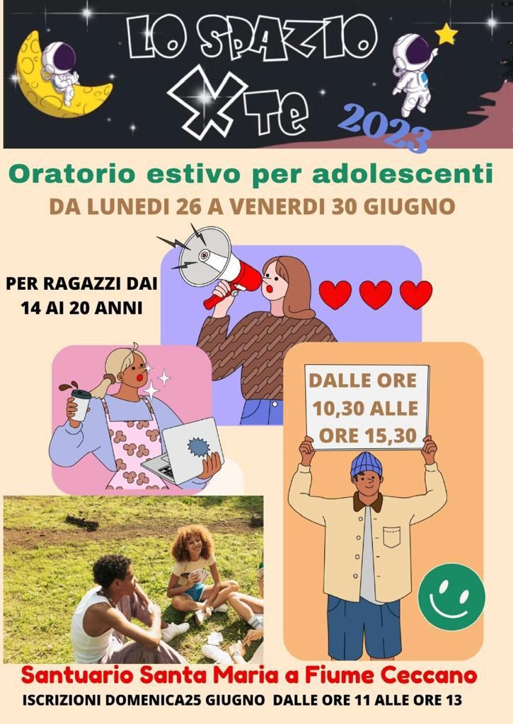 L’Oratorio è l’espressione educativa della comunità parrocchiale, che si prende cura della crescita dei ragazzi e delle ragazze. Lo si legge in un post sulla pagine social del Santuario di Santa Maria a fiume a Ceccano. Quest’anno ci siamo interrogati – scrivono – su come poterci prendere cura di tutti quei ragazzi adolescenti che non svolgono in oratorio il servizio di animatori. La proposta è di realizzare un’esperienza estiva per ragazzi tra i 14 e 20 anni nella quale renderli protagonisti. Lo Spazio X Te Esperienza estiva per Adolescenti inizierà lunedì 26 giugno e terminerà venerdì 30 giugno presso l’oratorio del Santuario Santa Maria a Fiume Lunedì, martedì, mercoledì e venerdì: dalle ore 10:30 alle ore 15:30.