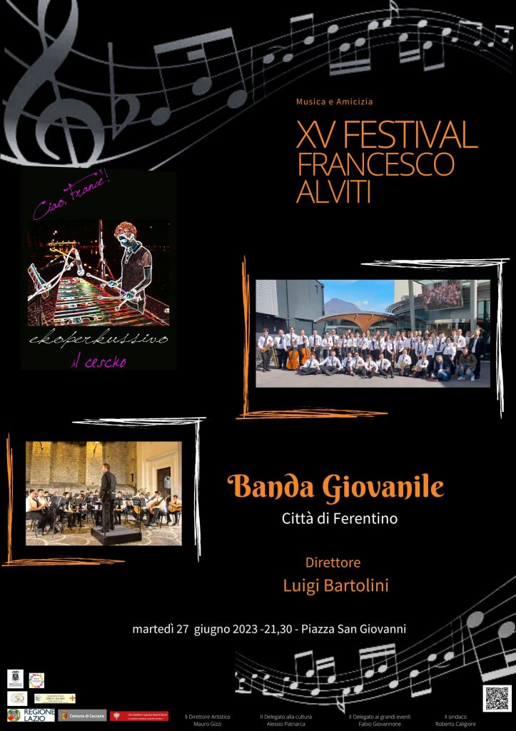 Stasera, martedì 27 giugno, alle ore 21,30, ci sarà il concerto della Banda Giovanile di Ferentino, diretta da Luigi Bartolini, recente vincitrice del concorso nazionale a Riva del Garda, con uno spumeggiante programma dedicato appunto alle giovani generazioni, seguita mercoledì 28 giugno, dall’Orchestra di fiati di Ferentino, diretta da Alessandro Celardi, trionfatrice del concorso internazionale in Olanda nel 2022, con un programma tutto dedicato ai grandi compositori europei. La banda di ferentino è stato il primo ensemble musicale in cui Francesco ha suonato come percussionista. Il giorno seguente, 29 giugno, serata conclusiva del Festival, con Di tanti palpiti, un palco all’opera, affidata alle voci dei solisti del Coro Josquin Des Pres, i soprani Vittoria D’Annibale, Cinzia Cristofanilli, Mariagrazia Molinari, Veronica Spinelli, il mezzosoprano Fabiola Mastrogiacomo, il tenore Enrico Talocco con Chiara Olmetti al pianoforte. La direzione artistica del Festival è curata da Mauro Gizzi. Hanno dato il loro patrocinio la Regione, la Provincia e il Comune di Ceccano. Il Festival si svolge in collaborazione con il Conservatorio Licinio Refice di Frosinone e con la Rete delle Associazioni di Ceccano, coordinata dalla Proloco.