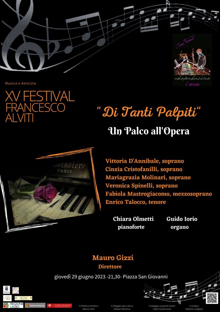 Di tanti palpiti, un palco all’opera sarà affidata alle voci dei solisti del Coro Josquin Des Pres, i soprani Vittoria D’Annibale, Cinzia Cristofanilli, Mariagrazia Molinari, Veronica Spinelli, il mezzosoprano Fabiola Mastrogiacomo, il tenore Enrico Talocco con Chiara Olmetti al pianoforte e Guido Iorio all’organo. La direzione artistica del Festival è curata da Mauro Gizzi. Hanno dato il loro patrocinio la Regione, la Provincia e il Comune di Ceccano. Il Festival si svolge in collaborazione con il Conservatorio Licinio Refice di Frosinone e con la Rete delle Associazioni di Ceccano, coordinata dalla Proloco.