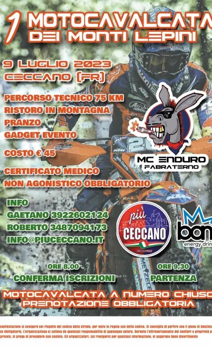 Correranno per 75 chilometri attorno e sopra il Siserno, estrema propaggine dei Monti Lepini, quasi a contatto con gli Aurunci. Partiranno alle 9,30 di domenica mattina dalla contrada Casamarciano di Ceccano per drigersi verso Castro dei Vosci e poi salire sul Monte Siserno all’altezza di Campo Lupino e ridiscendere poi per Villa S. Stefano, Amaseno e Giuliano di Roma. La manifestazione è organizzata dal Club Mc Enduro fabraterno. Già domenica scorsa, 2 luglio, c’era stato un altro motoraduno alla Badia di Ceccano. A quello di domenica 9 sarebbero iscritti più di 100 motociclisti