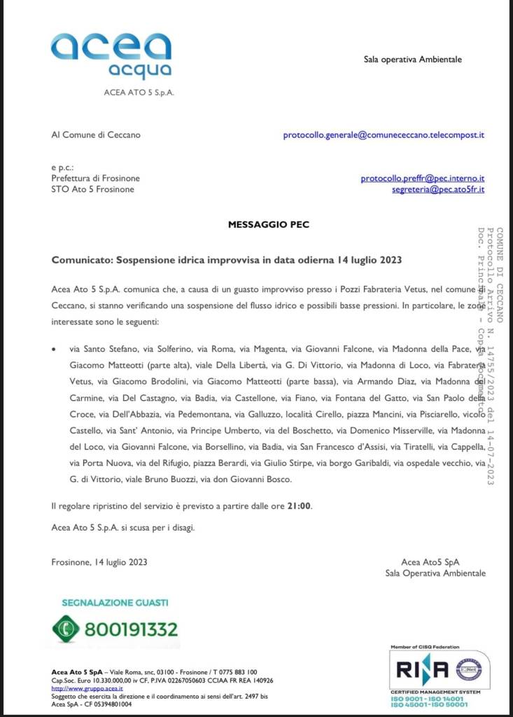 Al solito razionamento che riguarda tutto il centro di Ceccano si è aggiunto un guasto ai pozzi di viale Fabrateria Vetus, che Acea Ato5 ha comunicato a Palazzo Antonelli nella mattinata del 14 luglio ma nessuno ha pensato di avvisare in qualche modo i cittadini che l’hanno appreso dai rubinetti a secco e dai social. Nessun avviso sul sito del comune, né sulle pagine social, né dai pannelli luminosi. La Pec di Acea notificava al comune che a causa del guasto sarebbe mancata l’acqua per l’intera giornata a tutto il centro di Ceccano. Nessuna autobotte sostitutiva è intervenuta ad alleviare il problema che comincia ad assumere anche implicazioni di tipo sanitario. In più la beffa dell’annuncio della ripresa del flusso idrico per le ore 21, cosa che non è avvenuta, proprio nel momento in cui viene tolta per il consueto razionamento. Al momento non si sa quando tornerà l’acqua.