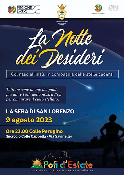 L’appuntamento è a Colle Perugino, il punto più alto del territorio di Pofi, alle 22 di mercoledì 9 agosto, per esprimere desideri o soltanto per ammirare lo spettacolo unico delle efemeridi, le lacrime di S. Lorenzo. Si tratta di una delle iniziative di Pofi d’Estate 2023.