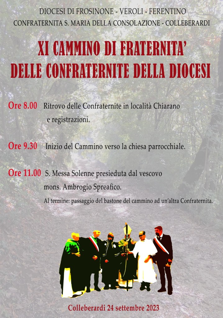 Domenica 24 settembre , ognuna con il suo gonfalone e i confratelli nel saio che la identifica, giungeranno a Veroli le Confraternite, provenienti dalle varie parrocchie della Diocesi di Frosinone-Veroli-Ferentino, per lo svolgimento del Cammino diocesano delle Confraternite, giunto all’undicesima edizione: si rinnova un appuntamento annuale, che era stato sospeso a causa della pandemia da Covid-19.