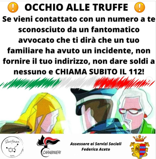 Attenzione, se vieni contattato da un fantomatico avvocato che ti dice che un tuo familiare ha avuto un incidente, non dare il tuo indirizzo, non dare soldi, chiama subito il 112. E’ il testo di una card che dovrebbe raggiungere tutta la popolazione. Le truffe agli anziani, infatti, sono troppe. C’è un forte allarme tra la cittadinanza e così, con il coordinamento dell’Associazione Serotonina, in collaborazione con il Centro Anziani “Gli Cuncone”, il Comando dei Carabinieri di Ceccano, nella figura del Luogotenente Fabio Laurentini e l’Assessore ai Servizi Sociali del Comune di Ceccano Federica Aceto, nasce una campagna informativa per divulgare le informazioni utili per la tutela dei più fragili nel caso si dovessero trovare in situazioni di difficoltà o dubbio.