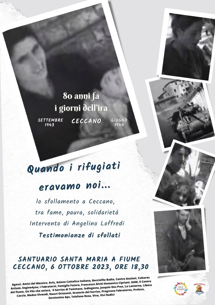 Oltre mille soldati tedeschi nel settembre del 1943 gli avevano occupato le case, naturalmente prendendo le migliori, gli requisivano gli animali, rastrellavano gli uomini per i lavori forzati al fronte di Cassino, da due anni ormai i ceccanesi pativano la fame tanto da assaltare i forni. E poi arrivarono dal cielo le bombe, quando nessuno credeva che avrebbero colpito Ceccano. Erano mesi che vedavano passare quegli aerei, alti: vanno a Frosinone, vanno a Roma, dicevano, ritenendo che Ceccano non meritasse neppure una bomba. Invece, sarebbe stata colpita oltre 30 volte. Schiacciati fra i due fuochi, l’occupazione tedesca e le bombe alleate, i ceccanesi scapparono, lasciando tutto, case, averi, abitudini, affetti, diventarono profughi, gli sfollati appunto. Il paese si svuotò, la paura e il terrore si spostarono nelle campagne. Di tutto questo si parlerà venerdì 6 ottobre a Santa Maria a fiume, a Ceccano, alle ore 18,30 per Quando i rifugiati eravamo noi, il secondo incontro de I giorni dell’ira, l’iniziativa per la ricostruzione della memoria a 80 anni dalla guerra a Ceccano, realizzata dalla Rete delle Associazioni, coordinata dalla Proloco. Sarà Angelino Loffredi, già sindaco di Ceccano, a tracciare un quadro della situazione nei giorni che precedettero il bombardamento del 3 novembre e poi nei mesi successivi. Con lui ci saranno gli sfollati di quel tempo, che racconteranno le loro terribili esperienze ma narreranno anche della solidarietà che trovarono. Ci sarà anche un’analisi di filmati e fotografie di quei giorni.