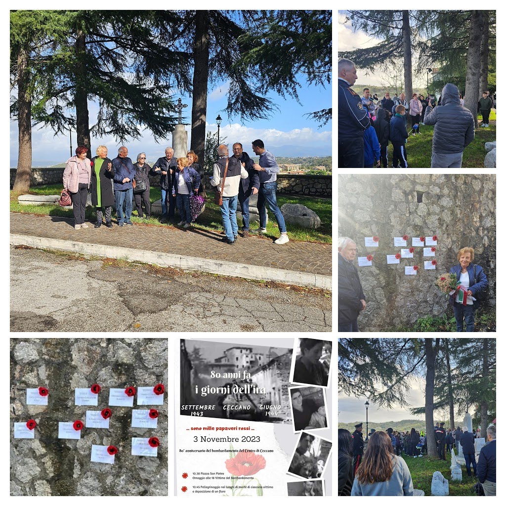 Così Agostina Pizzuti ha raccontato la sua esperienza ai bambini e ai ragazzi delle scuole di Ceccano che hanno affollato Piazza S. Pietro, nell’ottantesimo anniversario del bombardamento che distrusse intere famiglie quel tragico 3 novembre 1943: avevo 5 anni, la mia casa era lì dove oggi c’è il parcheggio, stavo giocando con le mie compagne, recitavamo la filastrocca, è l’ultima cosa che ricordo. Mi tirarono fuori dalle macerie di casa qualche ora dopo. Fui fortunata, ma mi sono portata e mi porto ancora oggi i segni della guerra in questi 80 anni. Agostina ha rappresentato i superstiti di quella strage che distrusse famiglie, affetti, sogni e desideri. E stamattina, 3 novembre 2023, 80 anni dopo quei terribili momenti, la rete delle associazioni di Ceccano, insieme ai ragazzi delle scuole, ha voluto ricordare quelle 18 vittime innocenti, con un cartello plastificato con il nome e l’età e un fiore rosso, realizzato dall’Associazione un filo che unisce. Chiunque passerà per quei luoghi li vedrà e potrà capire quanto la guerra sia apportatrice di distruzione indiscriminata. Significativa manifestazione per le ore buie che stiamo vivendo. Erano presenti anche le vittime delle famiglie che vennerfo quasi completamente cancellate in quella mattinata. Vi ha partecipato anche il delegato alle attività culturali del comune di Ceccano, Alessio Patriarca. La giornata si completerà stasera alle 18,30 a Santa Maria a fiume con la presentazione del progetto I figli della guerra dell’Associazione Indiegesta, con la raccolta delle testimonianze all’interno delle famiglie e la loro pubblicazione su un apposito canale youtube.