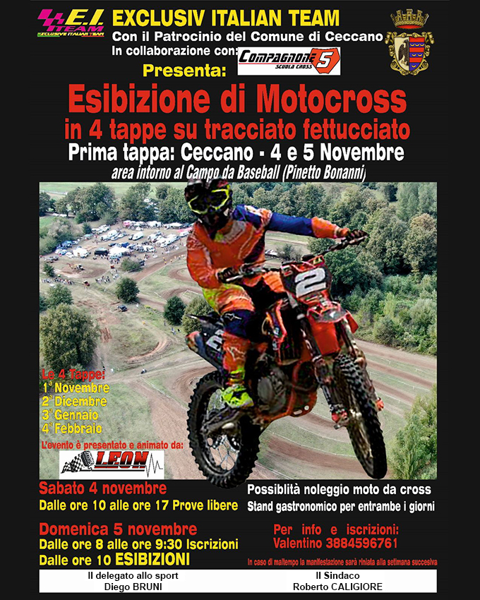 Sabato 4 per le prove e domenica 5 novembre per le esibizioni su tracciato “fettucciato”, come si legge sul manifesto dell’Exclusiv Italian Team, che organizza la manifestazione, con il patrocinio del comune di Ceccano, nell’area intorno al campo da baseball intitolato a Pinetto Bonanni. Le prove libere ci saranno sabato 4 novembre dalle 10 alle 17, mentre domenica 5 ci si potrà iscrivere fino alle 9,30, mentre le esibizioni si svolgeranno a partire dalla ore 10