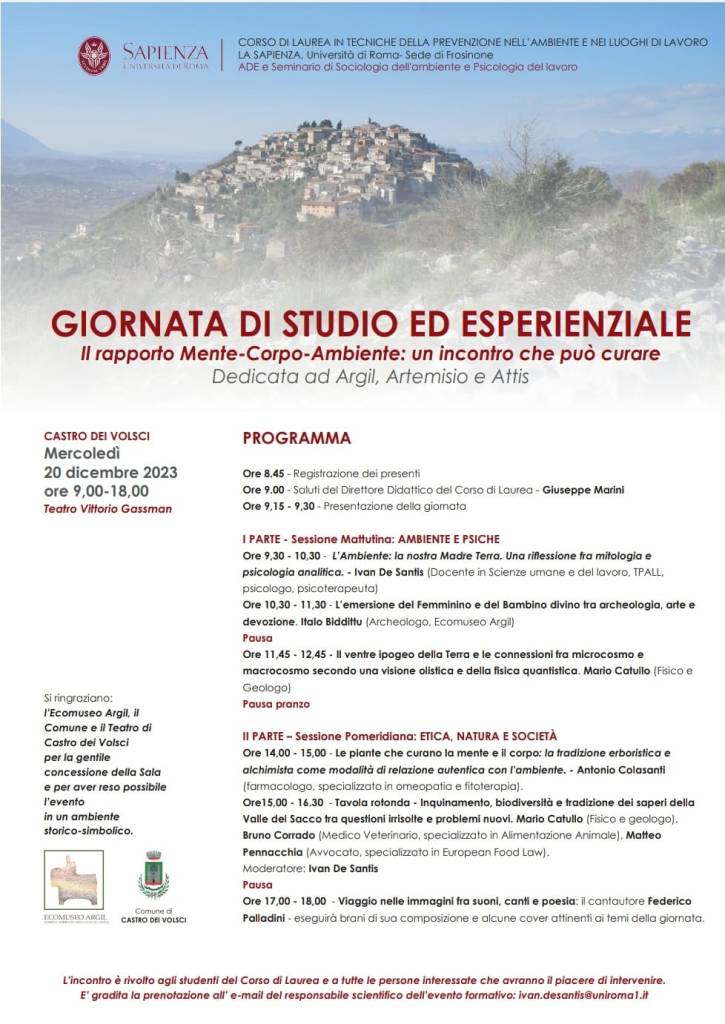 Il rapporto tra mente, corpo e ambiente sarà al centro della giornata di studio e di esperienze che si svolgerà a Castro dei Volsci mercoledì 20 dicembre a cominciare dalle 9. L’organizza l’Università La Sapienza di Roma, corso di laurea in tecniche di prevenzione nell’ambiente e nei luoghi di lavoro. Sono previsti, nella mattinata, gli interventi di Italo Biddittu, archeologo, direttore scientifico dell’ecomuseo Argil, del fisico e geologo Mario Catullo, di Ivan De Santis, psicologo e psicoterapeuta. Nel pomeriggio interverranno Antonio Colasanti, farmacologo specializzato in omeopatia e fitoterapia, Bruno Corrado, veterinario, Matteo Pennacchia, avvocato specializzato in leggi per la protezione della qualità alimentare. Il convegno prevede dibattiti sulla sicurezza degli alimenti, sulla fauna della Valle del Sacco tra inquinamento e biodiversità, erboristeria e relazione con l’ambiente. A conclusione, il cantautore Federico Palladini proporrà un viaggio nelle immagini tra suoni, canti e poesia.