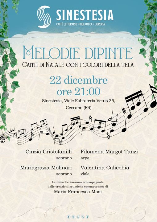 Due soprani Cinzia Cristofanilli e Mariagrazia Molinari, accompagnate dall’arpa di Filomena Margot Tanzi e dalla viola di Valentina Calicchia, presenteranno le più belle melodie di Natale, per il primo concerto del Caffè Letterario Sinestesia a Ceccano. Il canto sarà arricchito dalle creazioni artistiche estemporanee della giovanissima Maria Francesca Masi. L’appuntamento è per venerdì 22 dicembre alle ore 21:00.