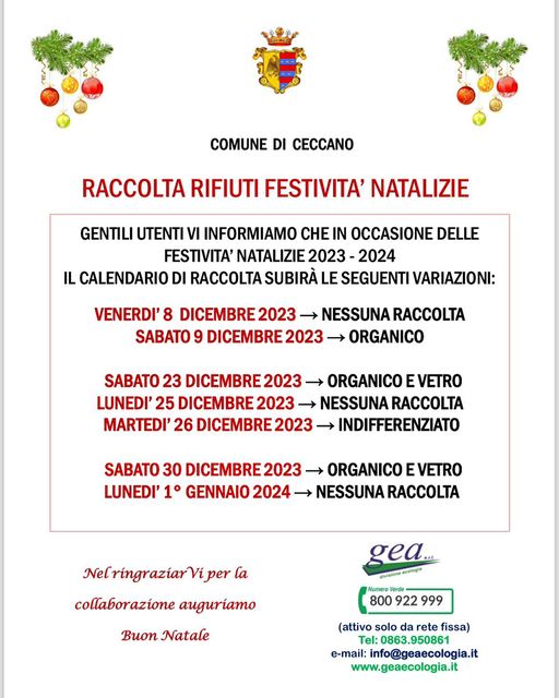 Persiste la singolare consuetudine del comune di Ceccano di ritirare due volte di seguito l’umido nelle contrade, dove abitano i due terzi dei cittadini vetuscolani. Sono le disposizioni per le festività che, appunto, faranno raccogliere di nuovo l’umido domani, sabato 30 dicembre, dopo averlo già ritirato oggi, venerdì 29. L’umido sarà poi raccolto di nuovo, nelle contrade, venerdì 5 gennaio.