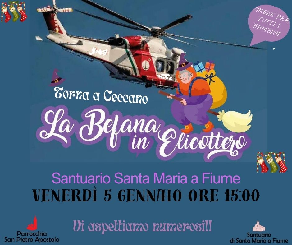 Niente scope obsolete per la Befana del santuario di Santa Maria a fiume a Ceccano. Come tradizione, oggi, 5 gennaio, alle 15, i bambini avranno la sorpresa di veder scendere dal cielo, in elicottero, l’adorata vecchietta, carica di giocattoli e calze. Le leccornie sono state acquistate grazie alla tombola solidale tenuta il 10 dicembre dalla Pro loco durante l’iniziativa il Borgo diventa Presepe, in collaborazione con la rete delle Associazioni.