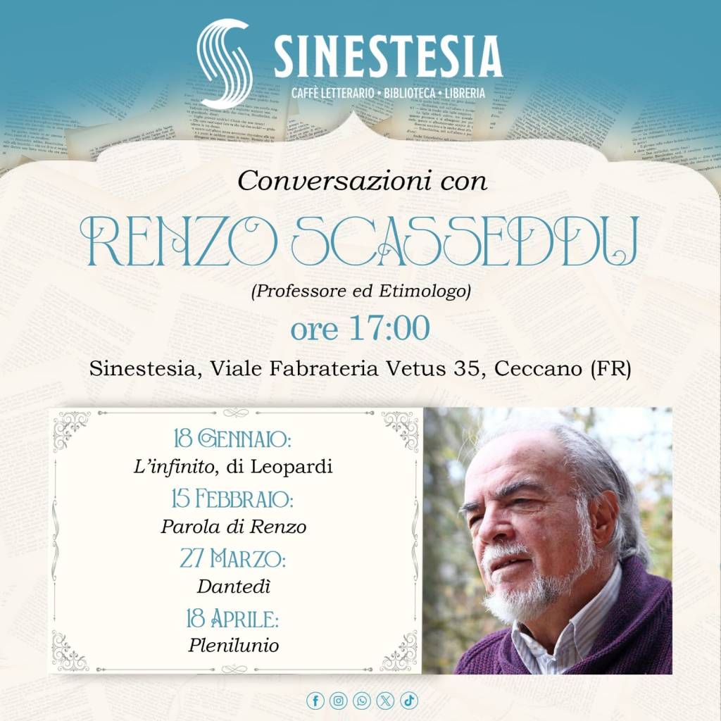 I 15 versi più famosi della poesia lirica italiana saranno letti e presentati da Renzo Scasseddu, grecista ed etimologo, giovedì 18 gennaio, alle ore 17 al caffè letterario Sinestesia, a Ceccano, in viale Fabrateria Vetus. L’incontro sull’Idillio del poeta recanatese è il primo di un ciclo di 4 in cui Renzo Scasseddu affronterà di volta in volta temi fondamentali dell’espressione poetica. L’Infinito di Giacomo Leopardi fu composto nel 1819 da un giovane ventunenne: forse per questo lo sentiamo particolarmente vicino a noi e capace di rappresentare il nostro sentire pur a due secoli di distanza.