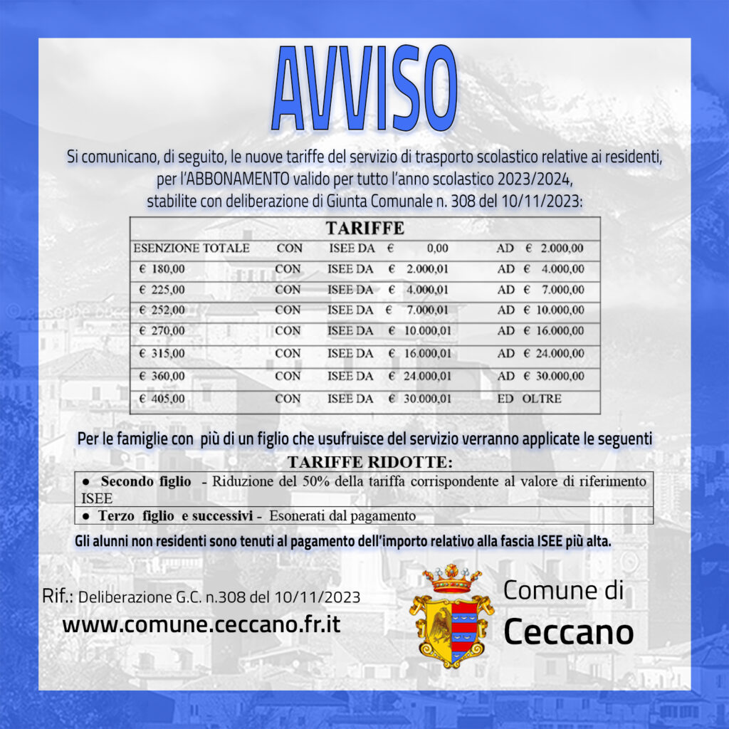 Scadrà il prossimo 27 gennaio, alle 13,30, il termine per la presentazione delle offerte da parte delle ditte interessate a gestire il trasporto scolastico a Ceccano, attualmente in regime di proroga. Qui potete leggere il bando Il valore della gara è di 182 mila euro, per il servizio dal 1° febbraio alla fine dell’anno scolastico. Intanto il sito del comune rende note le tariffe del servizio, stabilite dalla Giunta il 10 novembre scorso, ed entrate in vigore il 1 gennaio 2024.
