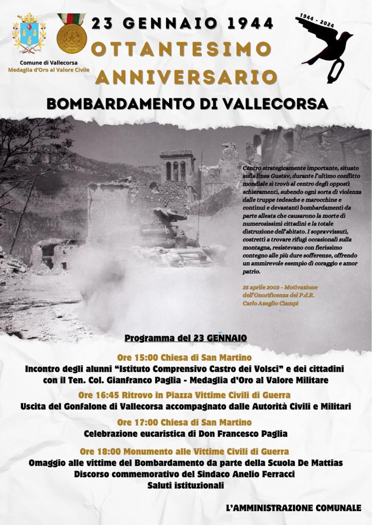 91 morti, l’80 per cento dell’abitato distrutto: fu il risultato di quelle bombe che segnò tragicamente il passaggio della guerra a Vallecorsa, il 23 gennaio 1944. Sono i giorni dei bombardamenti alleati su tutte le cittadine fra Cassino e Anzio. L’aviazione alleata cerca di bloccare il trasferimento di truppe dalla linea Gustav al fronte di Anzio dove il giorno prima, il 22 gennaio c’era stato lo sbarco. I bombardamenti sono furiosi ed indiscriminati su ogni strada di comunicazione. Vallecorsa ne fa le spese in maniera terribile. Qualche mese dopo, attorno al 20 maggio, avrebbe subito anche le violenze dei goumiers del Corpo di Spedizione Francese: furono registrate oltre 100 donne violentate. Oggi, 23 gennaio 2024 Vallecorsa, insignita della medaglia d’oro al valor civile, ricorda quella terribile giornata con una serie di manifestazioni che inizieranno alle 15,30 nella Collegiata di San Martino con l’incontro dei ragazzi delle scuole con il Ten. Col. Gianfranco Paglia, madaglia d’oro al valor militare.