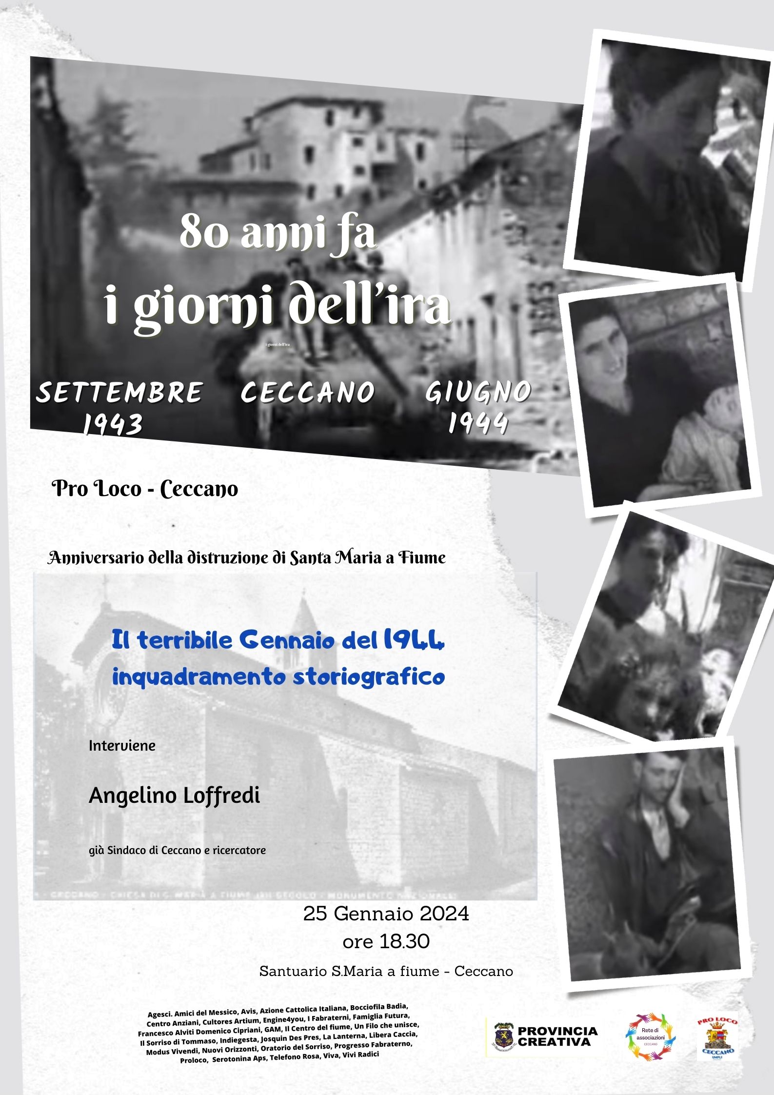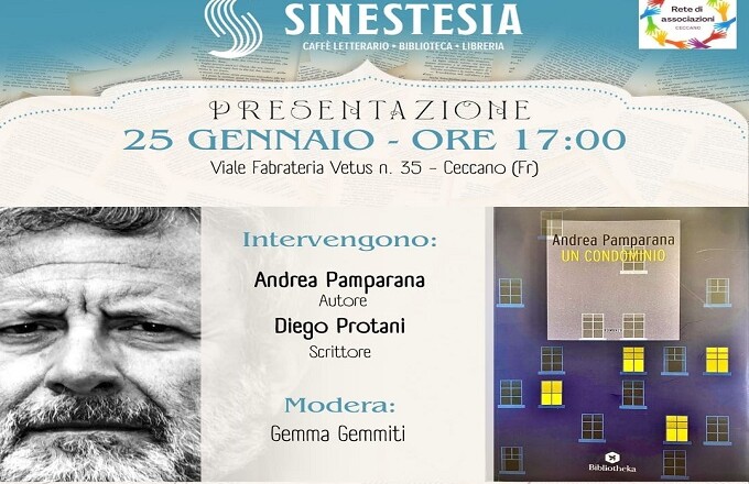 Doppio appuntamento con i libri giovedì 25 gennaio a Ceccano: si inizierà alle 17, al Caffè Letterario Sinestesia, con Andrea Pamparana, giornalista, già vicedirettore del TG5, che presenterà il suo libro Un condominio, edito da Bibliotheka edizioni, sulle disavventure personali dei residenti in un condominio, appunto, la cui vita viene bloccata da una epidemia improvvisa. Alle 18,30, a Santa Maria a fiume, nell’ambito delle iniziative per l’80° anniversario del bombardamento della Chiesa, Angelino Loffredi, già sindaco di Ceccano e ricercatore storiografico, traccerà il quadro della situazione bellica nel gennaio del 1944, uno dei mesi più duri per la popolazione di Ceccano, fiaccata dal freddo durante lo sfollamento e sottoposta a continue incursioni aeree. In una di quelle, il 26 gennaio, verrà distrutta la chiesa di S. Maria a fiume. Entrambe le presentazioni sono curate dalla Rete delle Associazioni di Ceccano, coordinata dalla Proloco.