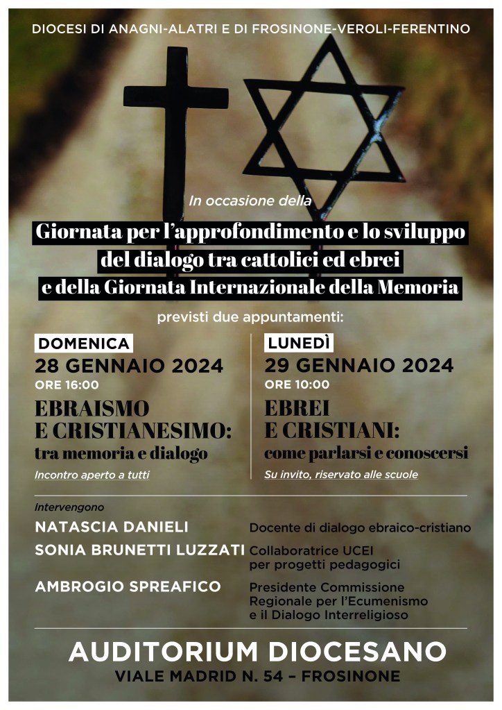 Due insegnanti, una cattolica e l’altra ebrea, dialogano insieme sul rapporto tra le due religioni nella storia del nostro Paese e nella situazione attuale, un dialogo serrato aperto al contributo di tutti, per conoscere, comprendere condividere differenze e punti di vista ma anche per celebrare la bellezza della comune origine di figli di Dio. Ecco il senso dei due convegni che la Diocesi di Frosinone, insieme con quella di Alatri Anagni, propone a tutti domenica 28 gennaio, alle ore 16, sul tema Ebraismo e Cristianesimo: tra memoria e dialogo, e lunedì 29, alle ore 10, per gli studenti delle scuole superiori, con a tema Ebrei e cristiani: come parlarsi e conoscersi. Entrambi gli incontri si svolgeranno nell’auditorium diocesano a Frosinone, in viale Madrid. A confrontarsi saranno Natascia Danieli, docente di dialogo ebraico-cristiano presso l’Istituto di Studi Ecumenici san Bernardino in Venezia, e Sonia Brunetti Luzzati, collaboratrice UCEI, Unione Comunità Ebraiche in Italia, per progetti pedagogici. Dialogherà con loro il vescovo, mons. Ambrogio Spreafico. L’iniziativa si inserisce nell’ambito della Giornata per l’approfondimento e lo sviluppo del dialogo tra cattolici ed ebrei (17 gennaio) e della Giornata Internazionale della Memoria (27 gennaio).