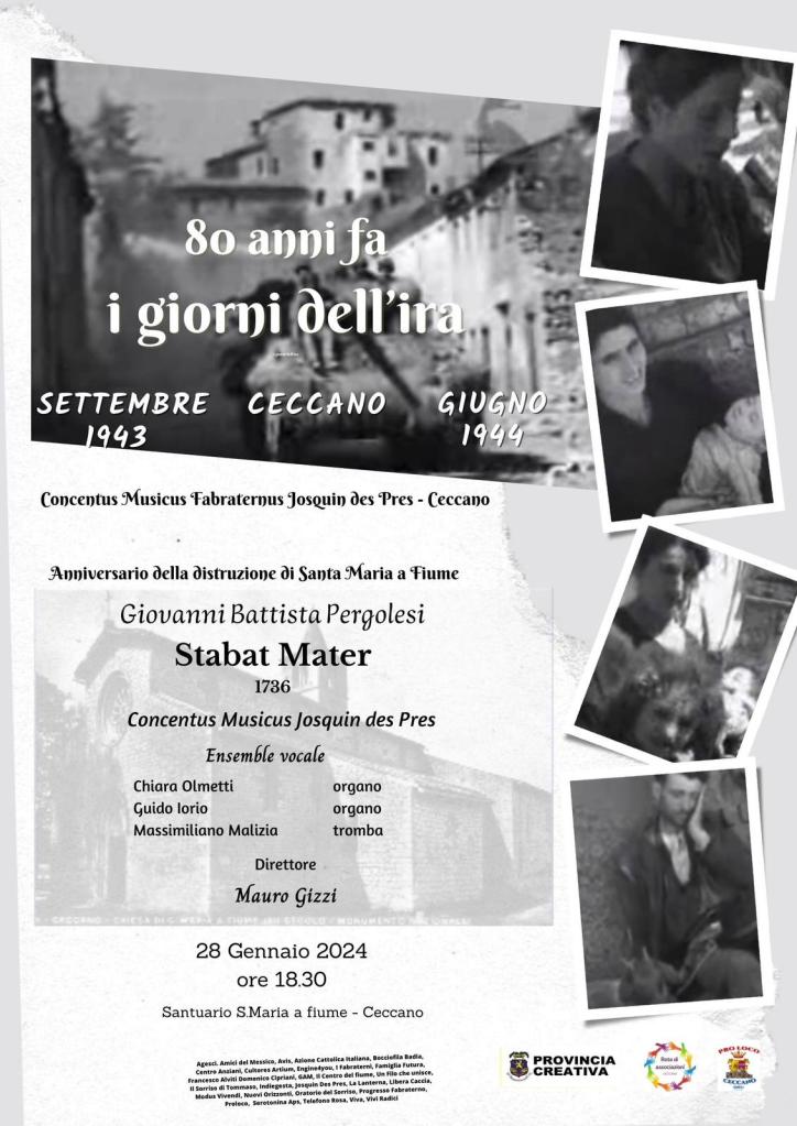 Maria rimane sotto la croce, mentre tutti gli altri fuggono per la paura, per la delusione di un progetto mancato, per un desiderio che non si era avverato. Le madri rimangono, pronte a dare la vita per i figli travolti dalla violenza ingiustificata. A questa figura, che rappresenta il dolore di tutte le madri, da quelle di Betlemme, a quelle della Shoah, a quelle di Gaza, poeti e musicisti hanno dedicato la loro arte. Così Giovanni Battista Pergolesi nel 1736 compone il suo Stabat Mater, con le parole dell’Inno medievale di Jacopone da Todi. Il dramma di Maria è il dramma di tutte le madri. E domenica 28 gennaio, a Santa Maria a fiume, a Ceccano, alle 18,30, i solisti del Concentus Musicus Fabraternus Josquin des Pres lo interpreteranno nel Santuario che la furia bellica distrusse 80 anni fa, il 26 gennaio del 1944, negli stessi giorni in cui le incursioni aeree e la rabbia dei soldati tedeschi seminavano la morte tra la popolazione, con 13 morti nel mese di gennaio. L’esecuzione è affidata alle voci di Vittoria D’Annibale, Mariagrazia Molinari, Veronica Spinelli, Antonella Cerroni, soprani, Fabiola Mastrogiacomo, Sara Mastrogiacomo, Alessandra Maura, Luisa Lauri, Loredana Martino, mezzosoprani, accompagnati da Chiara Olmetti e Guido Iorio all’organo, Massimiliano Malizia, tromba. La direzione è affidata a Mauro Gizzi.